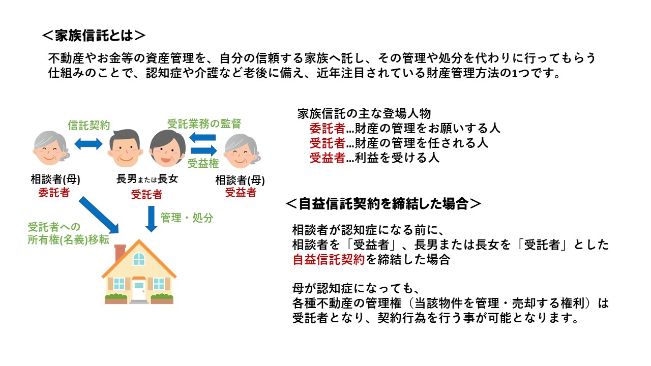 ①認知症になった場合、契約(法律)行為全般について“意思能力の有無”が問われる。そのため、相談者の代わりに長男・長女が、ご自宅の建て直し、売却に関する契約をするのは、特別な事情がない限り不可能で、不動産の改修も原状回復のみ可能と思われるため、各種不動産について家族信託の一つ“自益信託”契約を締結する